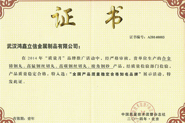 武漢鴻鑫立信金屬制品有限公司主要從事鋼丸、鋼絲切丸、鋼砂等除銹防腐耗材的生產(chǎn)和銷售。公司所有產(chǎn)品均通過ISO9001**質(zhì)量認(rèn)證,2014年更獲得了第三屆中國金屬磨料行業(yè)具有影響力品牌-華尊獎(jiǎng)。董事長陳群芝女士從事行業(yè)17年來專注為客戶節(jié)約鋼丸消耗成本,2014年獲得了華尊獎(jiǎng)-中國品牌建設(shè)實(shí)踐百名創(chuàng)新很好企業(yè)家的榮譽(yù)。服務(wù)過的國家建設(shè)項(xiàng)目有:北京鳥巢體育館、遼寧號(hào)航母、杭州灣跨海大橋、南海軍艦、成都雙流**機(jī)場、南車集團(tuán)動(dòng)車檢測中心、武漢火車站、武漢天興洲大橋等,同時(shí)服務(wù)的行業(yè)囊括橋梁制造、船舶制造、汽車制造、火車車輛制造、大理石打磨、鑄件清砂、各種機(jī)械制造表面清理等。鴻鑫鋼丸,值得信賴。